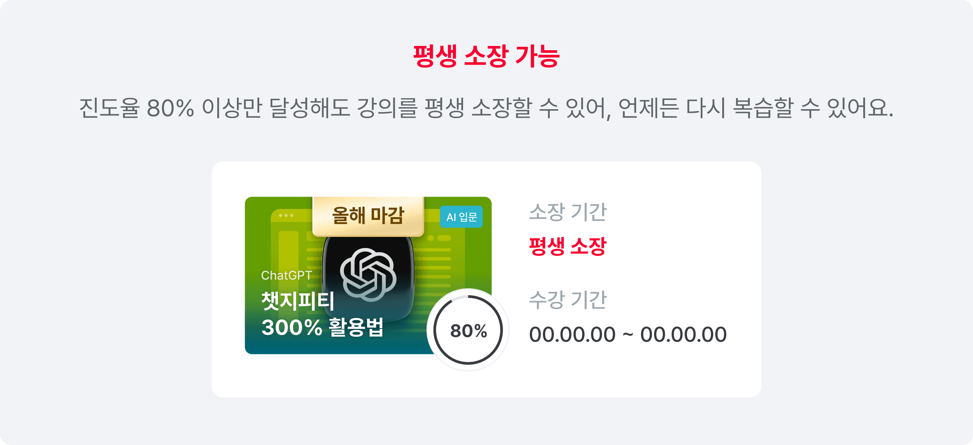 *종료 전 결제 시, 기존 수강 기간 내 학습이 가능하며 80% 이상 수강 완료 시 강의와 자료를 평생 소장하실 수 있습니다.