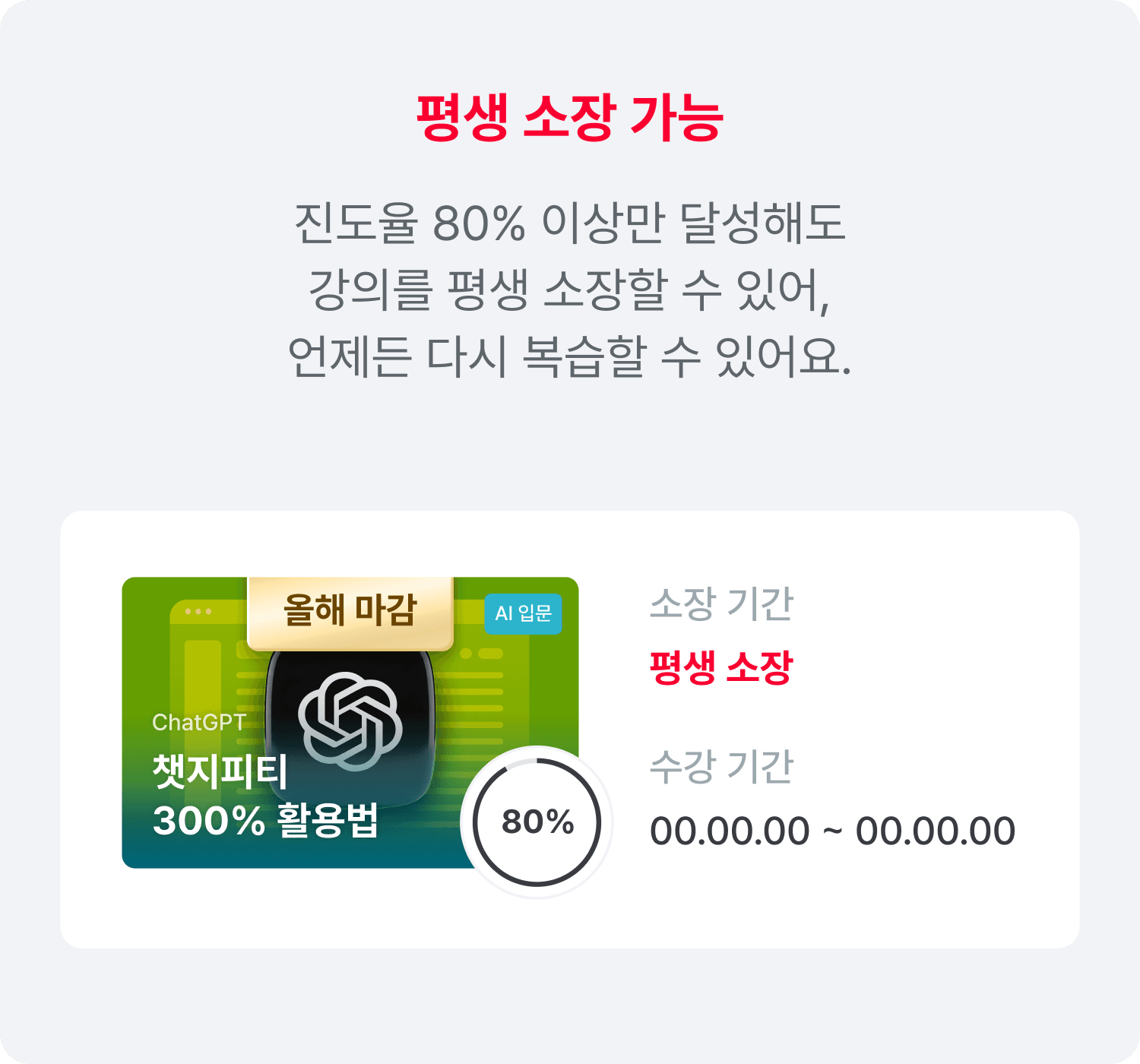 80% 이상 수강 완료 시 강의와 자료를 평생 소장하실 수 있습니다.